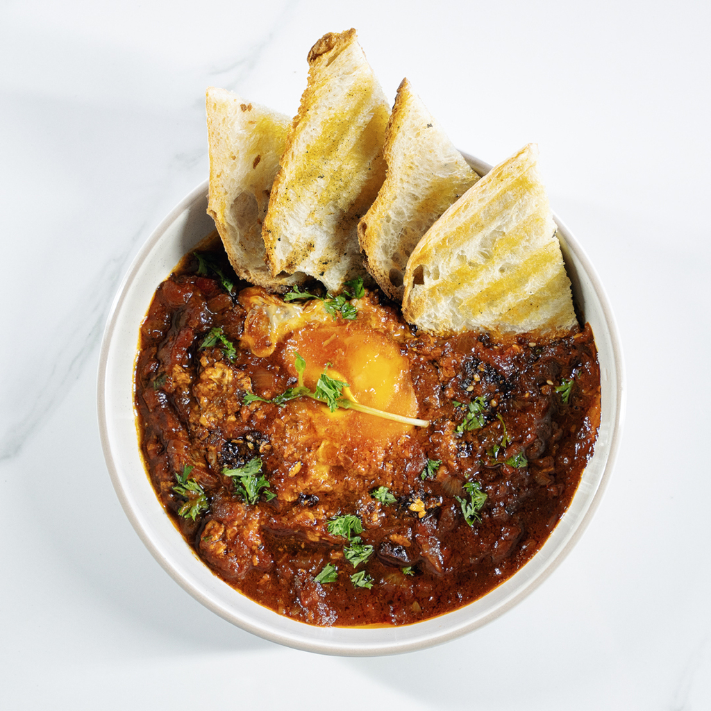 Our take on the Middle-Eastern classic, made with a Malaysian touch - slow-simmered tomatoes, onions and spices, topped with soft-poached eggs and fresh herbs.
