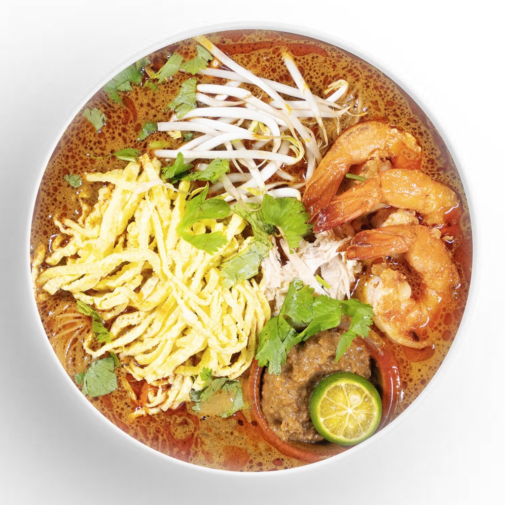 Sarawak's pride in a bowl - creamy, spiced broth poured over rice noodles, with shredded chicken, prawns, sliced egg and taugeh.